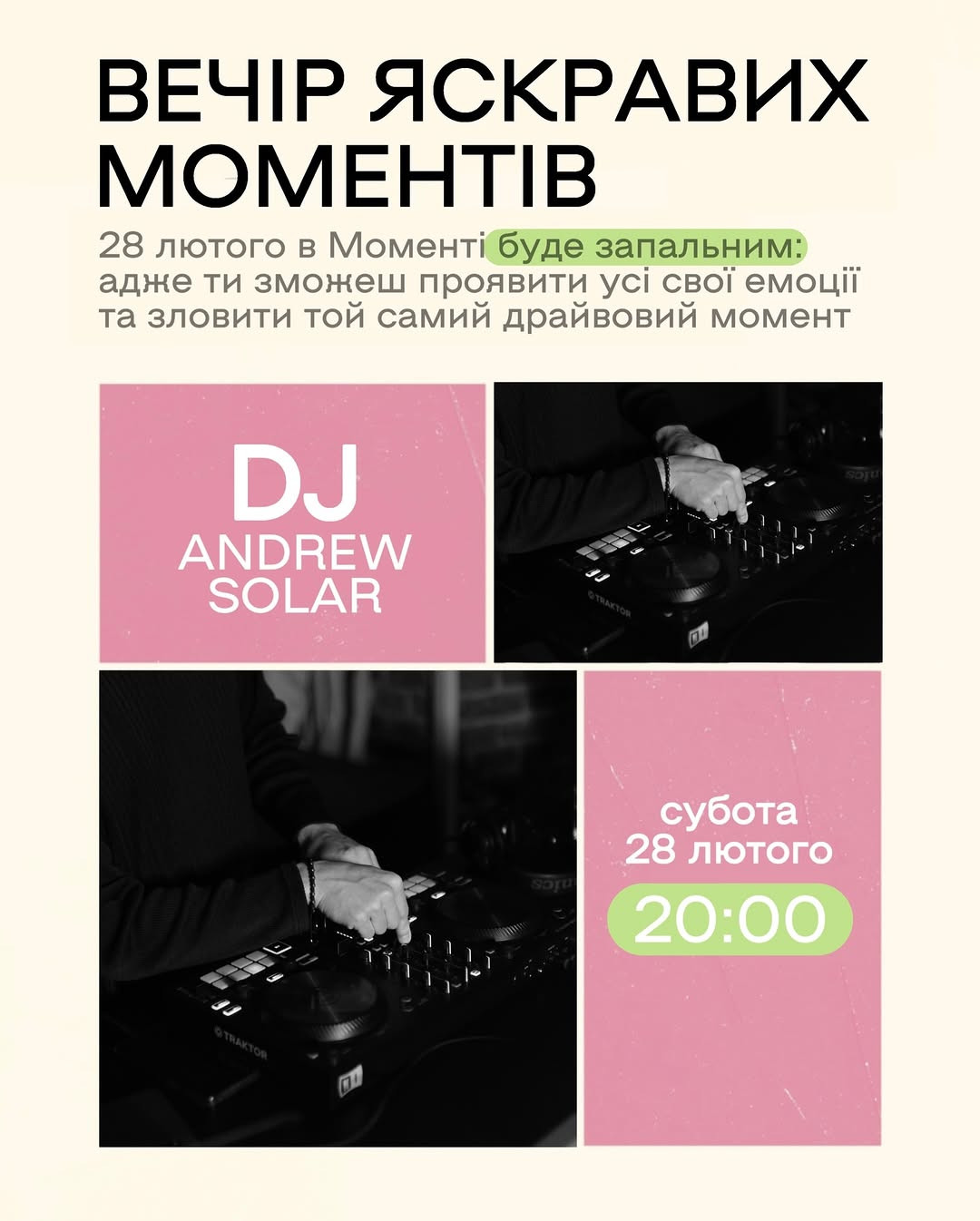 Запрошуємо Вас на вечір живої музики разом з Dj Andrew Solar. Продовжуємо зігрівати живою музикою ці романтичні вечори. Нехай весь світ танцює з тобою в один біт цього вечора. Лише ти, музика та твої особливі моменти.