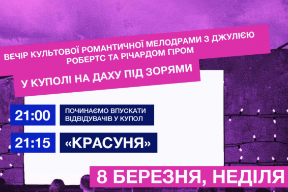 У ввечері, на даху під зорями будемо дивитися "Красуню" з Джулією Робертс та Річардом Гіром у головних ролях! Лише уявіть цю атмосферу — захід сонця, музика, культовий романтичний фільм та близькі люди поруч! Романтики та любові не буває забагато! Адже любов – це велика сила! А де є любов, там є життя! Тож запрошуйте близьких, беріть смаколики і приходьте на дах!