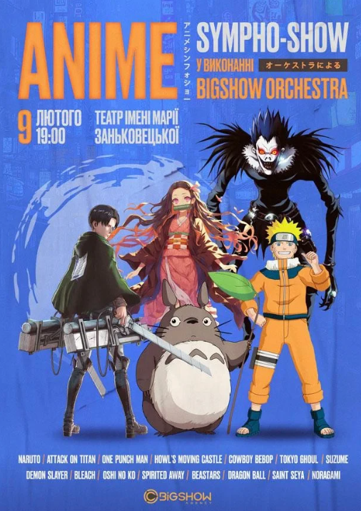 Запрошуємо на масштабне шоу від BIGSHOW ORCHESTRA, яке відкриває знайомі аніме-світи в абсолютно новому звучанні. Понад 20 культових композицій — від поетичної класики Хаяо Міядзакі до напружених драм Тецуро Аракі. Attack on Titan, Naruto, Oshi no Ko, Suzume, Dragon Ball, One Piece, Death Note, Howl's Moving Castle, Tokyo Ghoul, Demon Slayer, Evangelion, Bleach, Nana — і це лише частина великого музичного всесвіту, що оживе на сцені. Епічна музика у симфонічному виконанні, світлові та візуальні ефекти змусять серце битися в унісон з кожною історією.