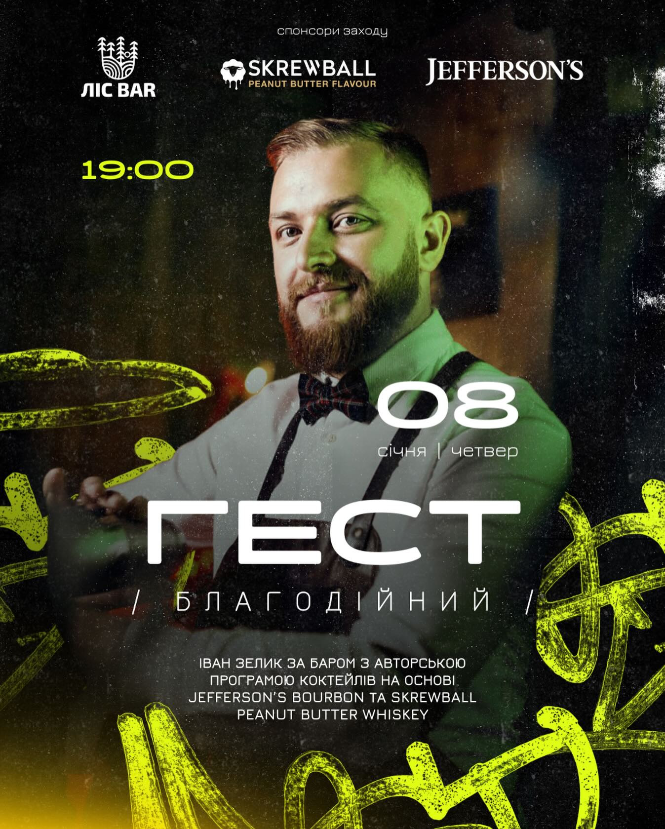 За баром Лісу — @zelyuk_ivan готуватиме авторські коктейлі на Jefferson’s Bourbon та Skrewball Peanut Butter Whiskey — спеціально для нашого бару.