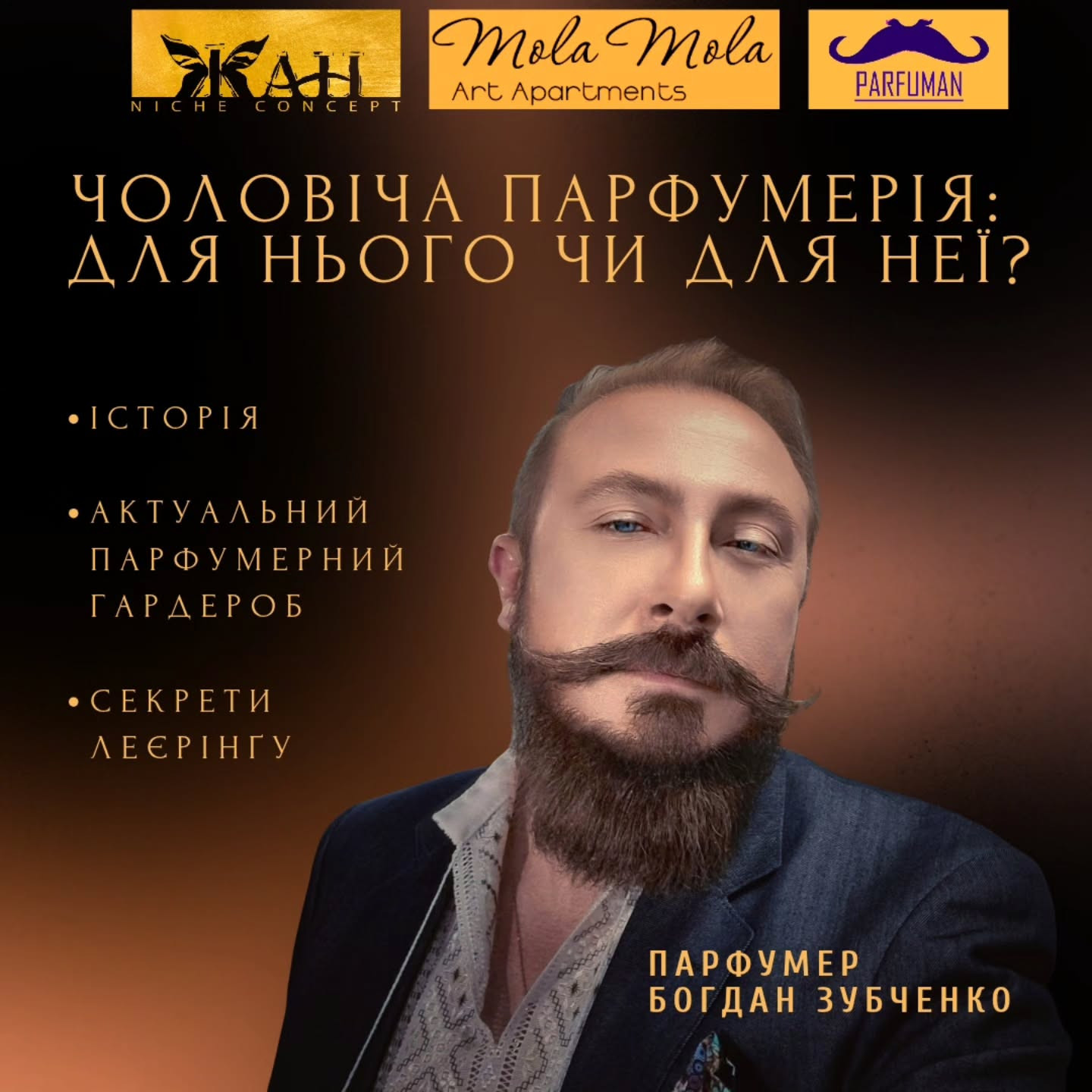 Радо запрошую в Art Apartments Mola Mola на прем'єру моєї лекції "Чоловіча парфумерія: для нього чи для неї?" Лекція зацікавить чоловіків та жінок, які готові разом зі мною досліджувати мистецтво ароматів, руйнувати стереотипи, дізнаватися про тренди, відкривати для себе секрети складання сучасного парфумерного гардеробу та способи леєрінґу. Також на публіку чекає сюрприз від бренду T. Belz та подарунки від партнера події - Жан niche concept.