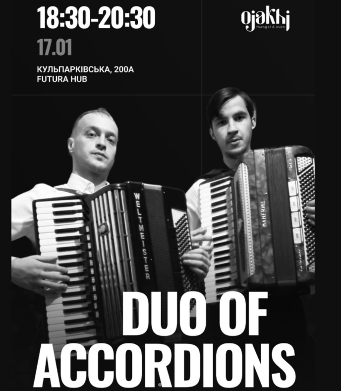 Зимові вечори стають ще теплішими з живою музикою в OJAKHI. Запрошуємо провести вечір у затишній атмосфері з живою музикою разом з Duo Of Accordions, смачними стравами та щирими емоціями.