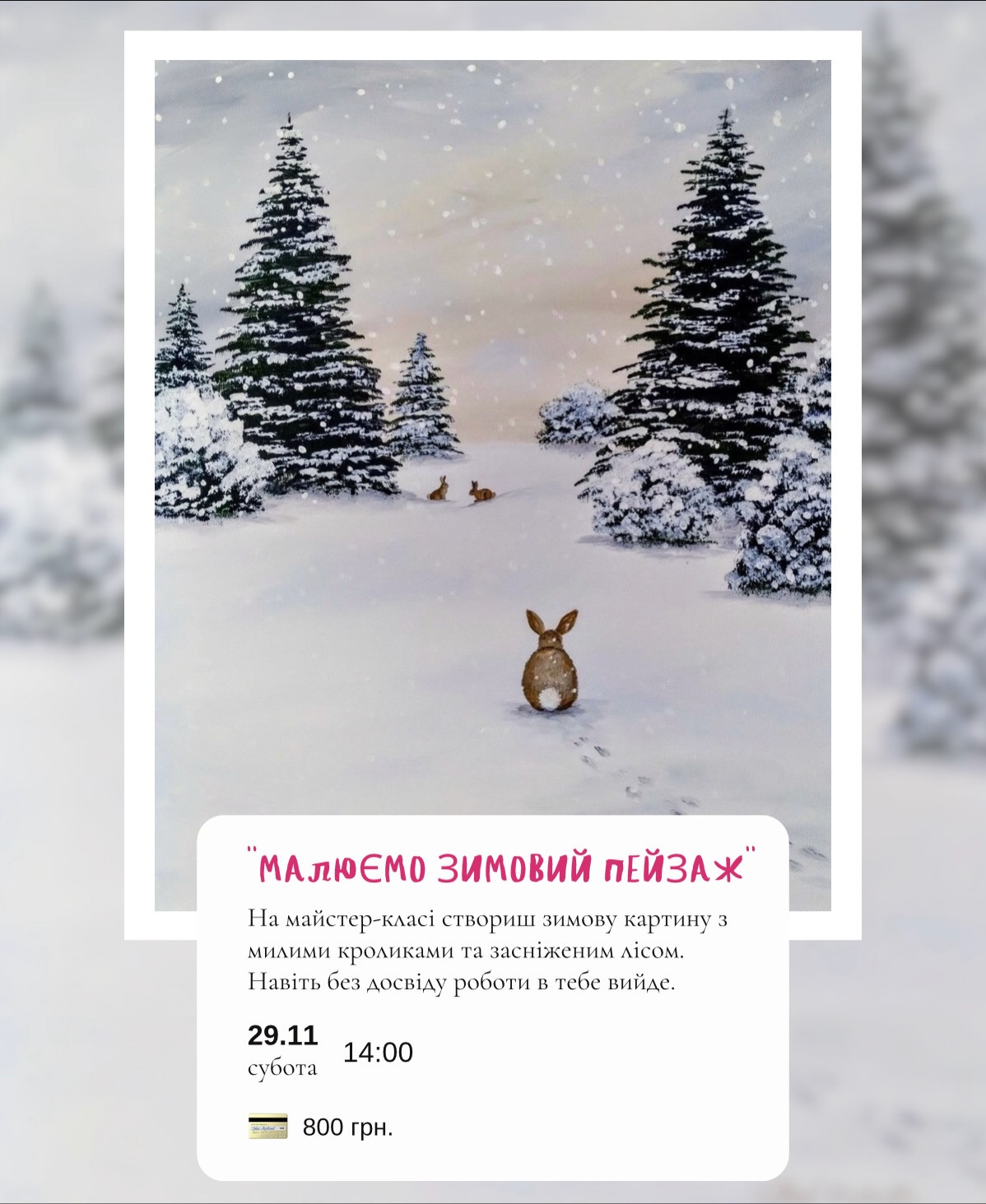 На майстер-класі створиш зимову картину з милими кроликами та засніженим лісом. Навіть без досвіду роботи в тебе вийде.