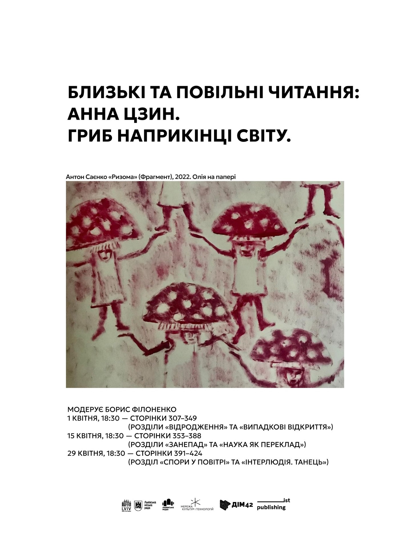 Протягом кількох місяців, від грудня 2025 до травня 2026, в ДІМ42 триватимуть близькі та повільні читання "Гриба…" Цзин за модерації Бориса Філоненка. Ми маємо довготривалу перспективу на десять зустрічей, за які зможемо обговорити всю книжку — від вступних слів і прологу, до 477 сторінки й слів "радісно це визнаю", якими завершується книжка. Наша мета — побачити, як зроблена ця книжка, як саме в ній переплітаються історії та практики, як вона написана та які методологічні орієнтири пропонує.