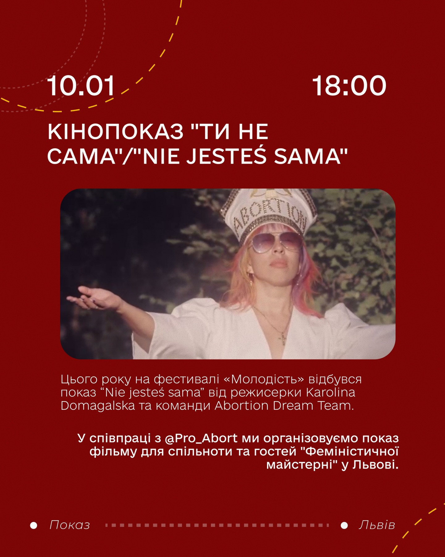 Цього року на фестивалі "Молодість" в Україні відбувся показ фільму Nie jesteś sama від режисерки Karolina Domagalska та команди Abortion Dream Team. У співпраці з @Pro_Abort ми організовуємо показ фільму для спільноти та гостей "Феміністичної майстерні".
