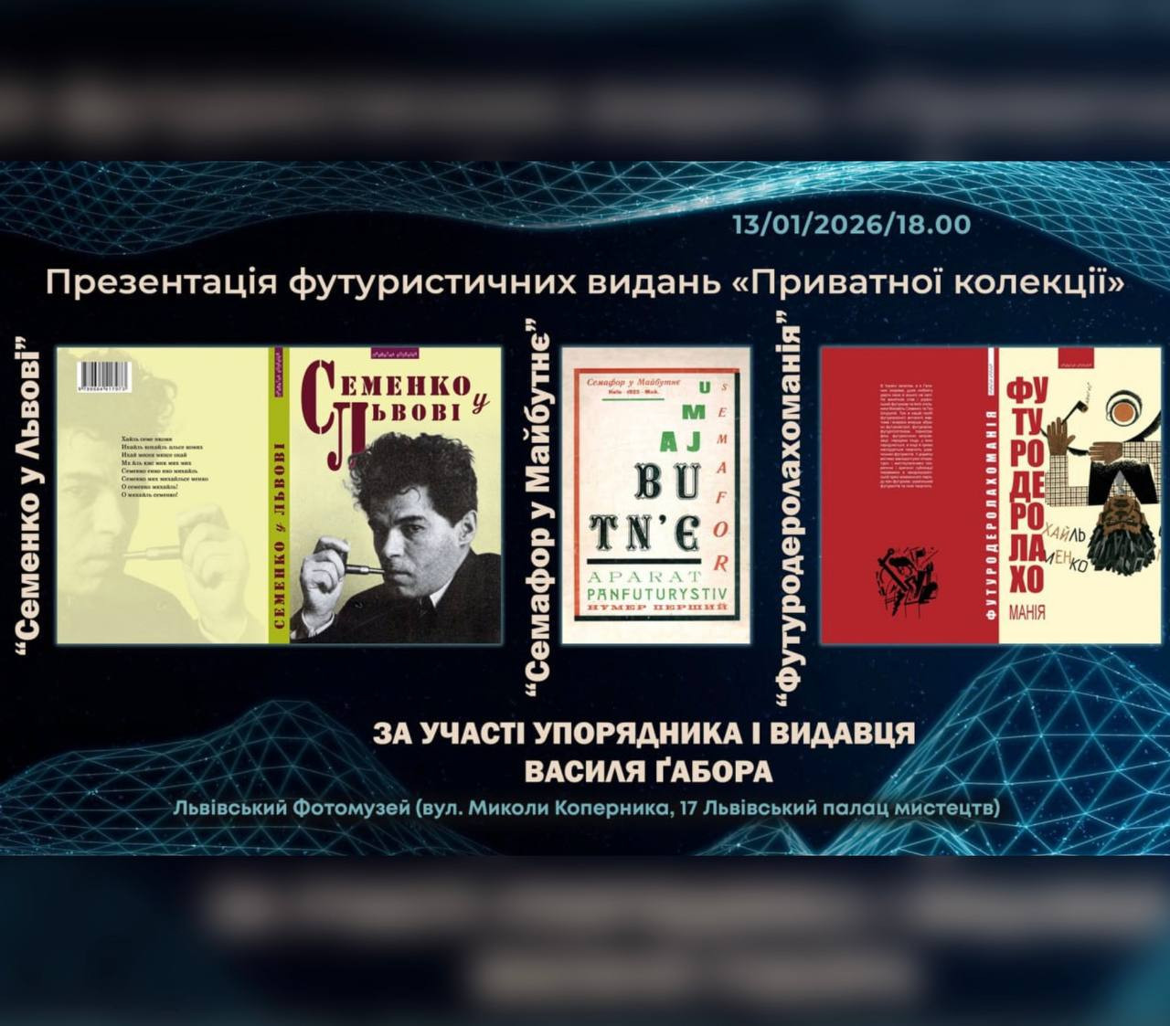 Запрошуємо на презентацію футуристичних видань "Приватної колекції" за участі упорядника і видавця Василя Ґабора. Будуть представлені книги "Семенко у Львові", "Семафор у Майбутнє" та "Футуродеролахоманія".
