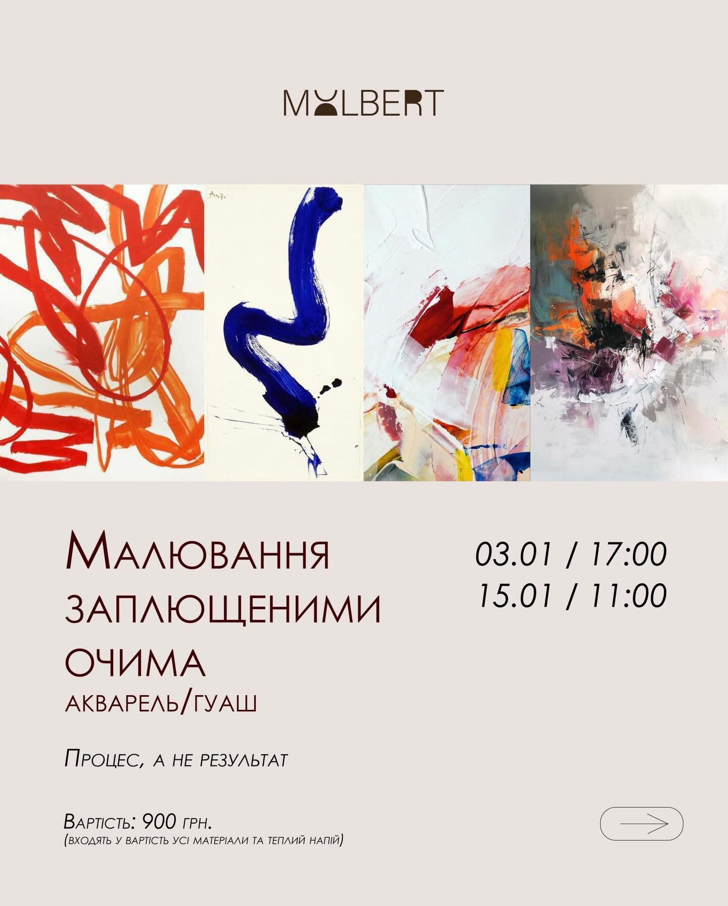 Після свят запрошуємо сповільнитися, видихнути та повернутися до себе через творчість. Будемо малювати заплющеними очима аквареллю або гуашшю. Тут головне процес, а не результат.