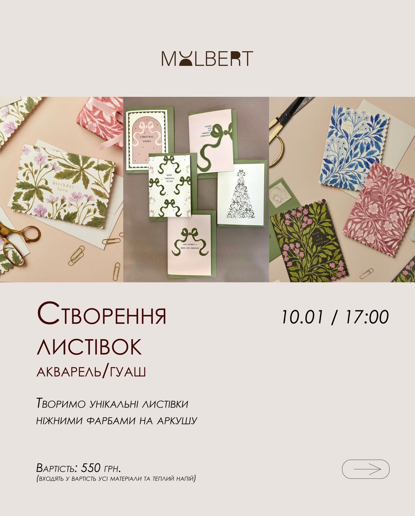 Ми створимо авторські листівки гуашшю чи аквареллю — яскраві, теплі й душевні. Це час для себе, де можна сповільнитись, відчути спокій і насолодитись творчим процесом.