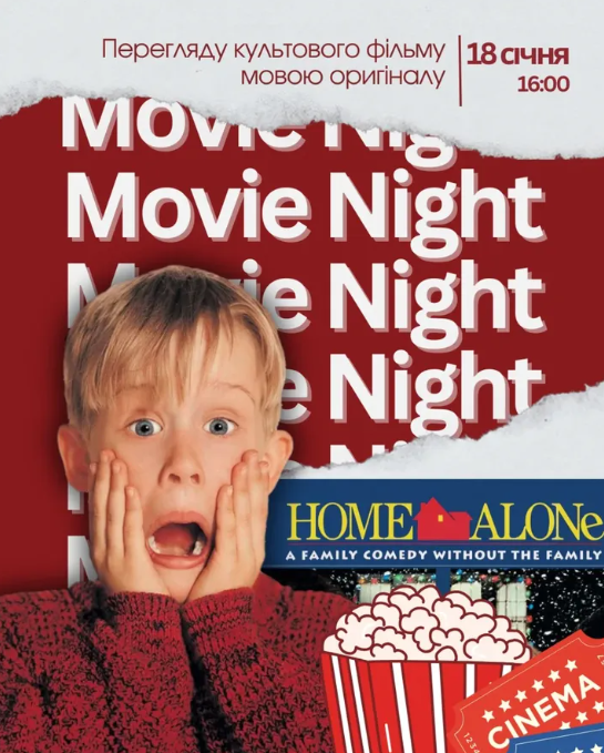 Запрошуємо на атмосферний вечір перегляду культового фільму "Home Alone" мовою оригіналу.