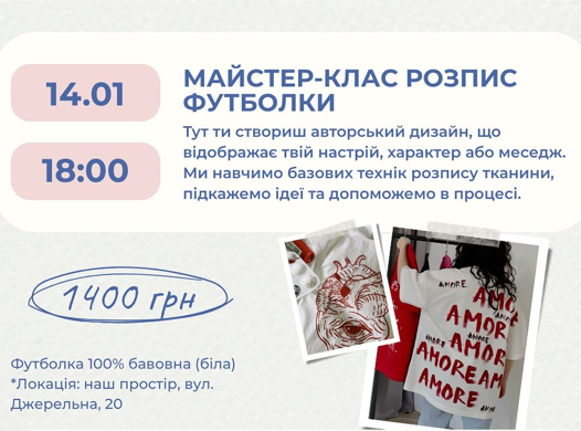 Запрошуємо на творчий майстер-клас, де Ви зможете розписати футболку, та створити свою оригінальну річ. Тут ти створиш авторський дизайн, що відображає твій настрій, характер або меседж. Ми навчимо базових технік розпису тканини, підкажемо ідеї та допоможемо в процесі.