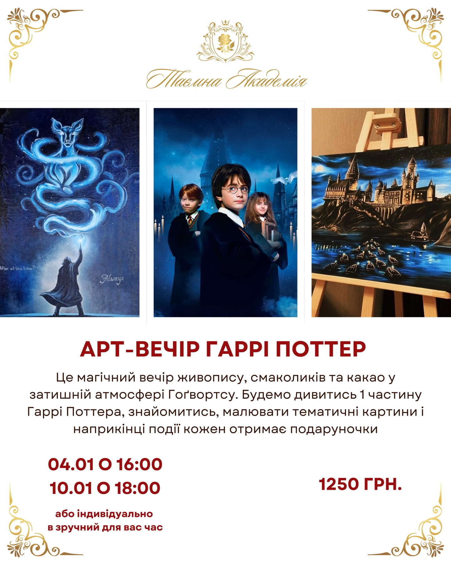 Це магічний вечір живопису, смаколиків та какао у затишній атмосфері Гоґвортсу. Будемо дивитись 1 частину Гаррі Поттера, знайомитись, малювати тематичні картини і наприкінці події кожен отримає подарунок.