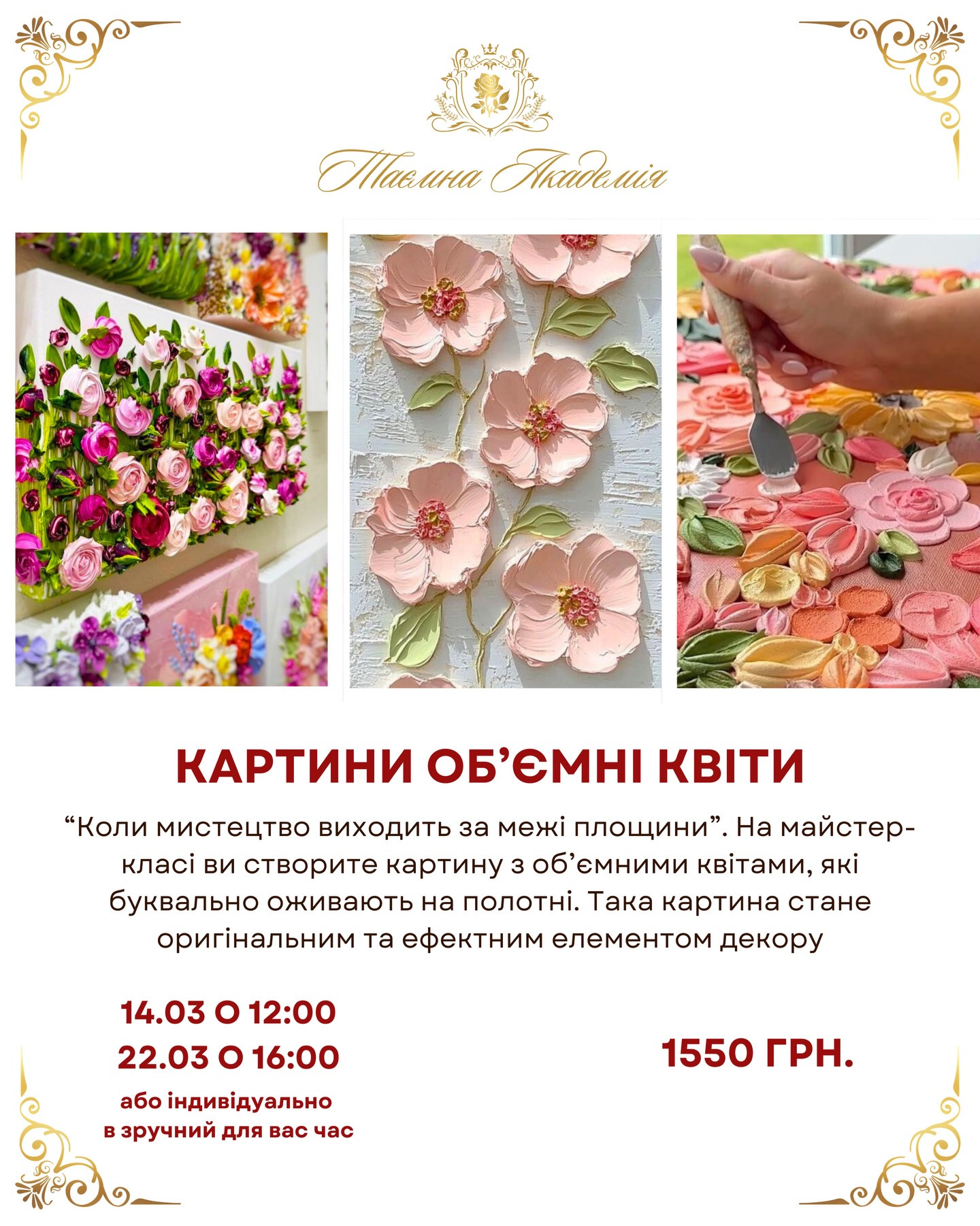 Запрошуємо поринути у романтичну мистецьку атмосферу. "Коли мистецтво виходить за межі площини". На майстер-класі ви створите картину з об'ємними квітами, які буквально оживають на полотні. Така картина стане оригінальним та ефектним елементом декору.