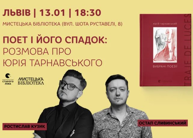 Літературний вечір, присвячений Юрію Тарнавському. Поети Остап Сливинський і Ростислав Кузик поспілкуються про життя й тексти Тарнавського, а також обговорять його останню книгу "Traje de luces. Вибрані поезії".
