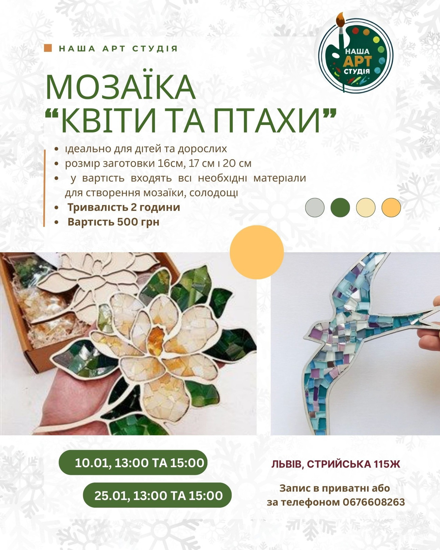 У вартість входять всі необхідні матеріали для створення мозаїки та солодощі.