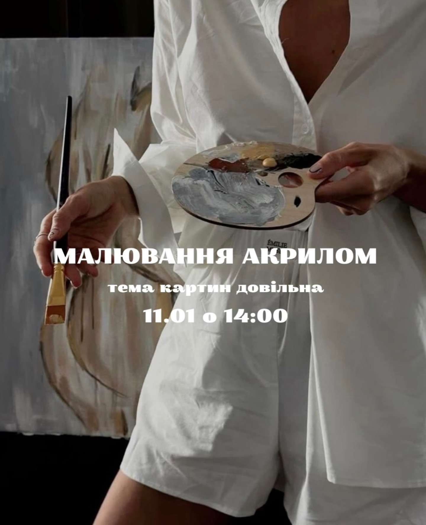 Під супроводом професійного художника ти створиш власну картину акрилом — довільна тема, яку обираєш саме ти: настрій, образ, колір, відчуття.