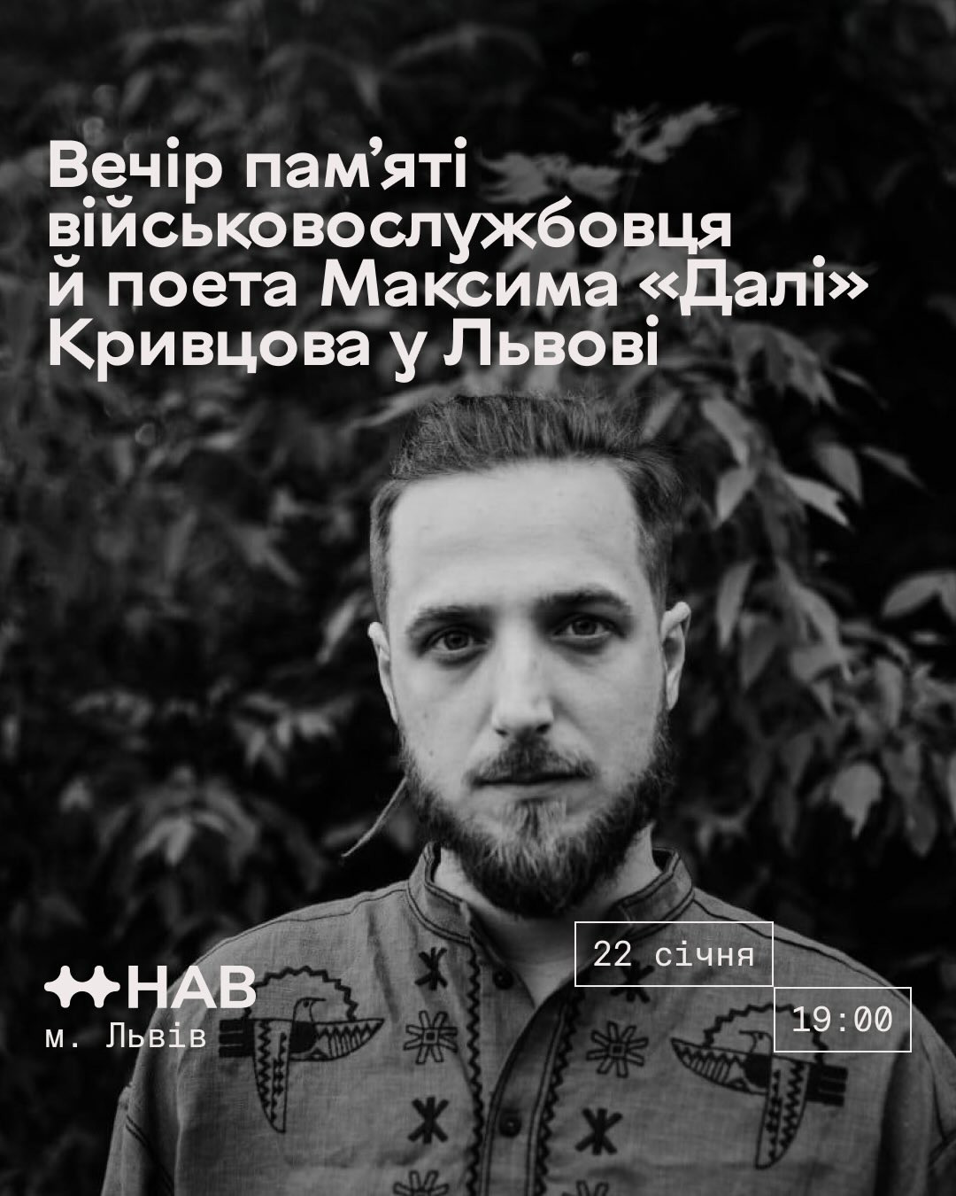 22 січня Максиму Кривцову мало б виповнитися 36 років. Та 7 січня 2024 року він загинув у бою на Харківщині. Вже другий рік поспіль у січні рідні, друзі та побратими Максима організовують вечори пам'яті — відкриті зустрічі, під час яких звучать вірші "Далі" й тексти тих, хто приходить розділити спогад і тишу.