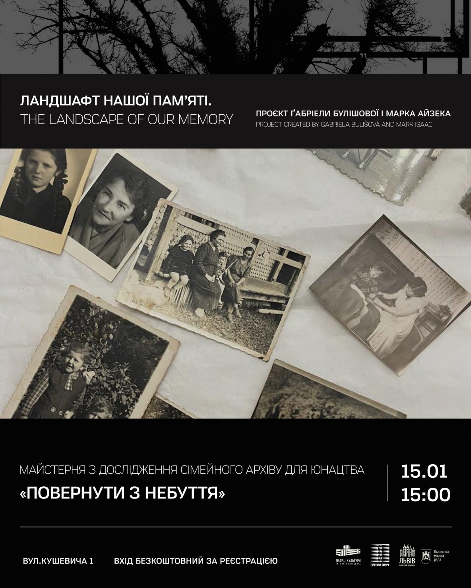 Запрошуємо на майстерню з дослідження сімейного архіву для юнацтва "Повернути з небуття", що відбудеться в рамках виставкового проєкту Марка Айзека та Габріели Булішової "Ландшафт нашої пам'яті"!