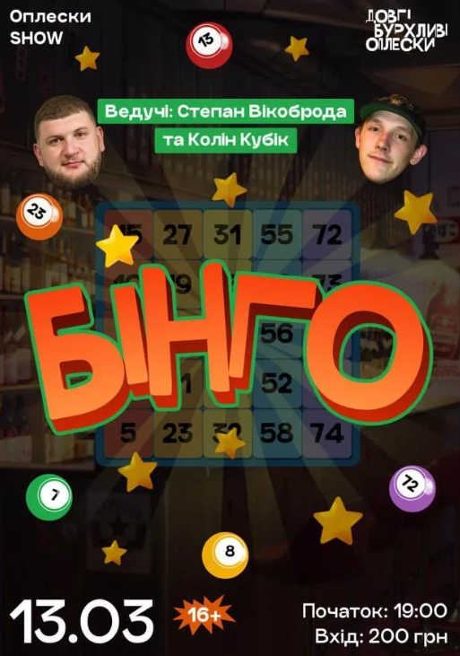 А вечір у Довгих Бурхливих Оплесках - це чудове поєднання азарту й гумору, адже ведучими вечора будуть стендап-коміки Степан Вікоброда та Колін Кубік!