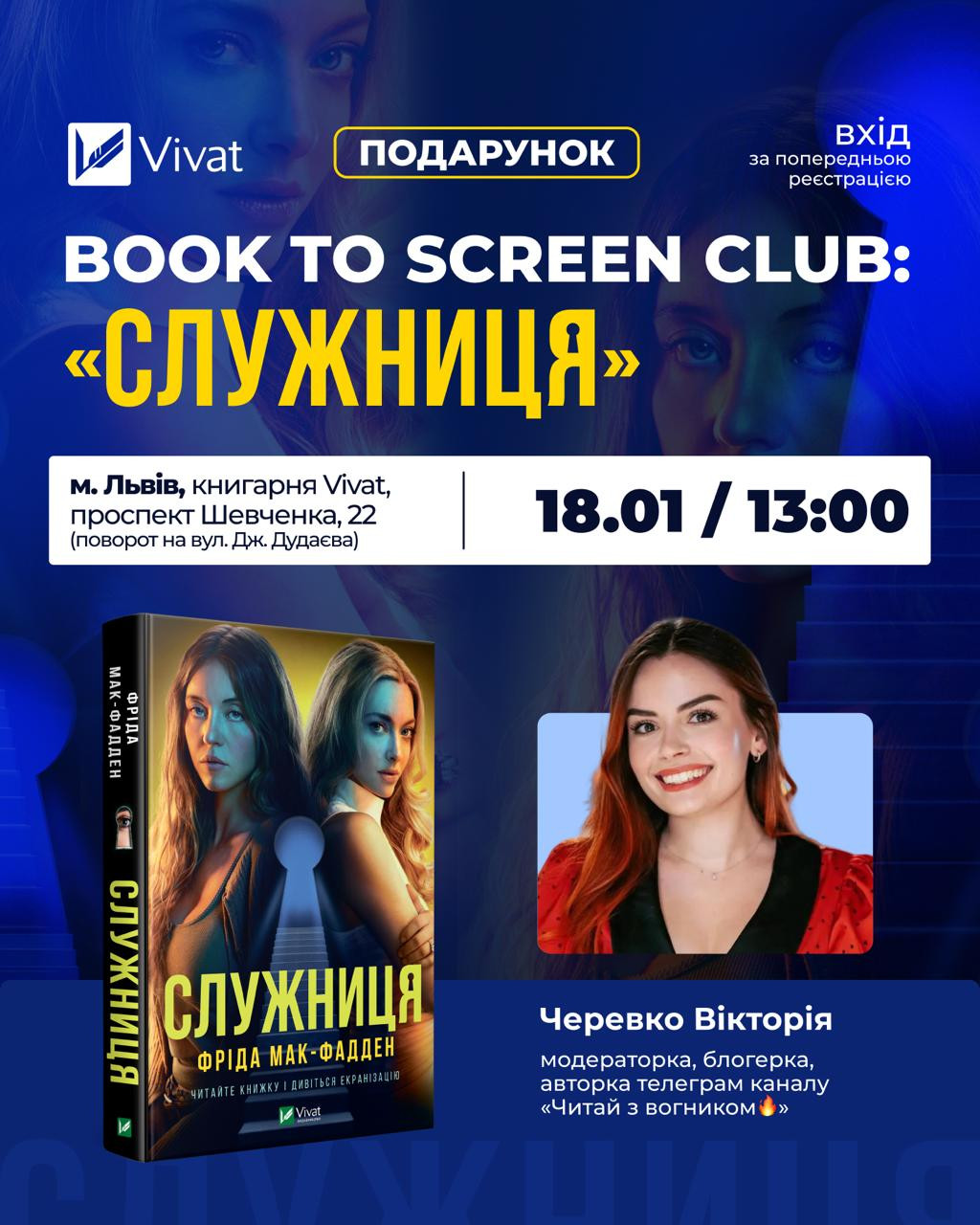 Запрошуємо на зустріч Book to Screen Club, де говоритимемо про роман Фріди Мак-Фадден "Служниця" та його екранізацію.