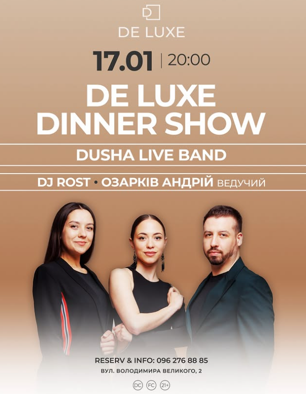 Запрошуємо на De Luxe Dinner Show. Вечір живої музики, вишуканої кухні та атмосфери свята.