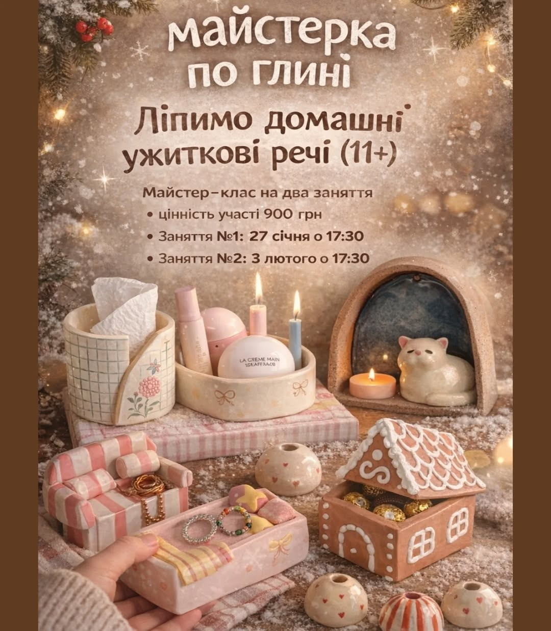 На майстер-класі будемо ліпити домашні ужиткові речі. Теплий, спокійний формат і корисні вироби для дому.