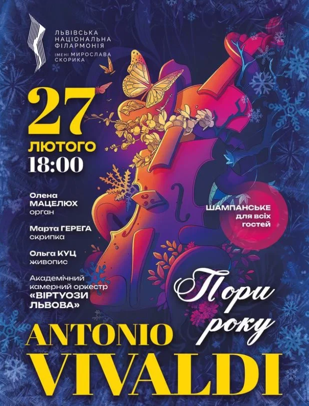 У сяйві сотень свічок, оживе безсмертна музика геніального Антоніо Вівальді. Камерний оркестр "Віртуози Львова" у супроводі органу (Олена Мацелюх) та скрипки (Марта Герега) виконають легендарний цикл "Пори року", наповнюючи простір теплом, гармонією та живими емоціями.
