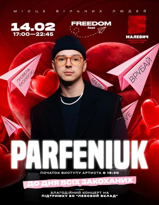 PARFENIUK — один із найяскравіших представників сучасної української сцени. Його пісні стабільно очолюють чарти, а кожен виступ вирізняється потужною подачею та тісним емоційним контактом із публікою. У цей вечір у залі звучатимуть хіти: "Врубай", "Хубба Бубба", "Температура", "На даху", "Відриваючись", "Провела екскурсію", "Долоні", "Забий" та інші популярні композиції.
