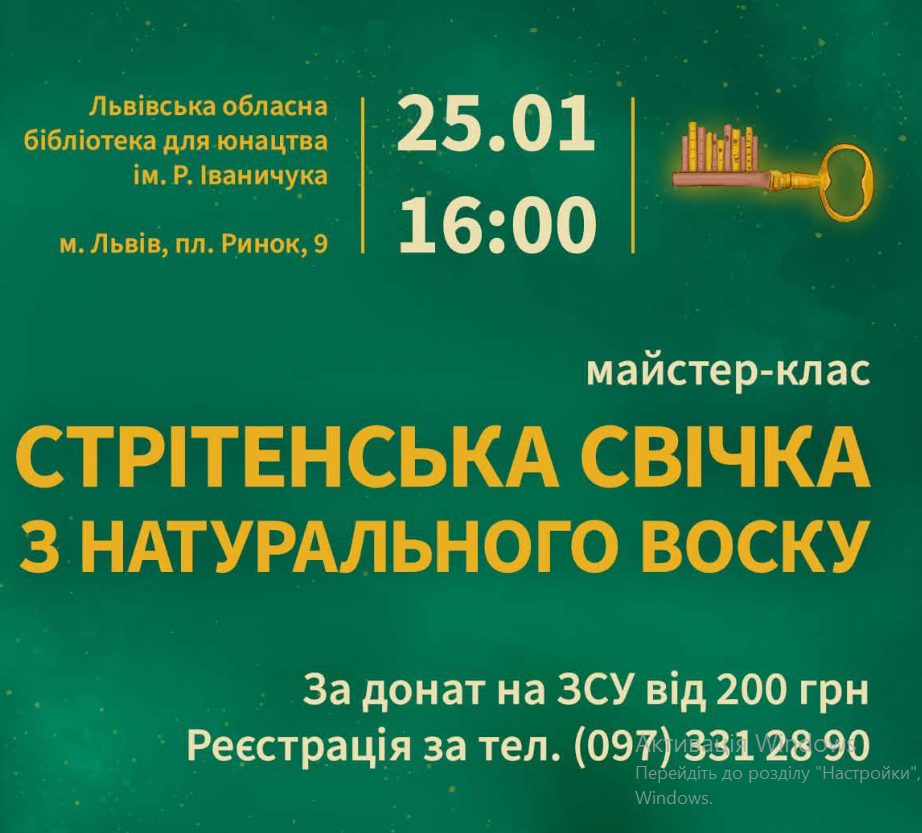 Запрошуємо на майстер-клас із виготовлення Стрітенської свічки з натурального воску. Наша золоторука Ольга Гудз допоможе й покаже, як зробити вашу свічку найкрасивішою. Матимете красу, Ви оновлену своїми руками, а заодно доєднаєтеся до підтримки ЗСУ.