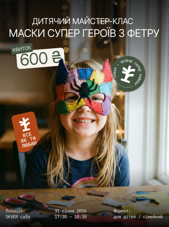 За годину разом із дітками ми зробимо яскраві маски з фетру — кожен обере свого супергероя, а потім забере виріб із собою.