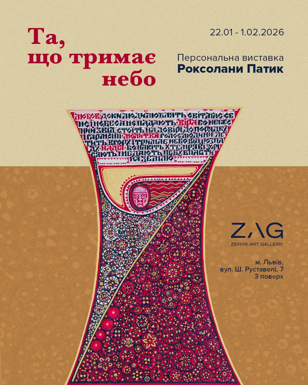 На виставці Роксолани Патик "Та, що тримає небо" представлені твори об'єднані образом Жінки як носійки життя, пам'яті та духовної сили. Проєкт звертається до глибинних архетипів — від первісної Великої Матері до узагальненого сакрального жіночого начала, що поєднує земне й небесне, тілесне й трансцендентне.