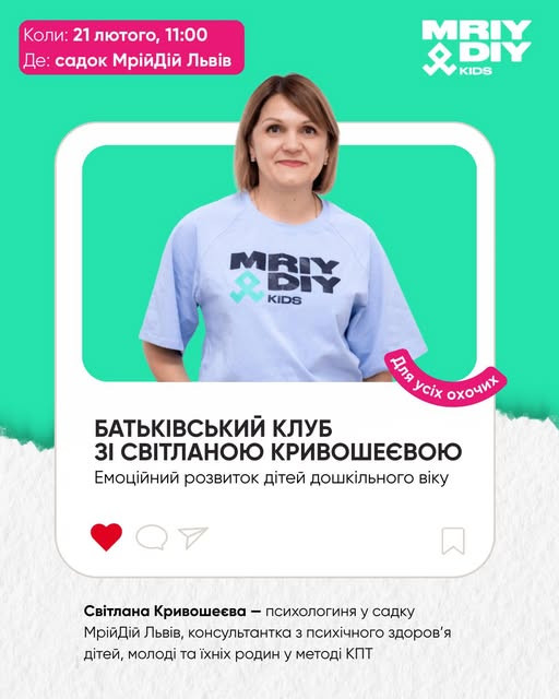Батьківський клуб зі Світланою Кривошеєвою — психологинею садка, консультанткою з психічного здоров'я дітей, молоді та їхніх родин у методі КПТ.