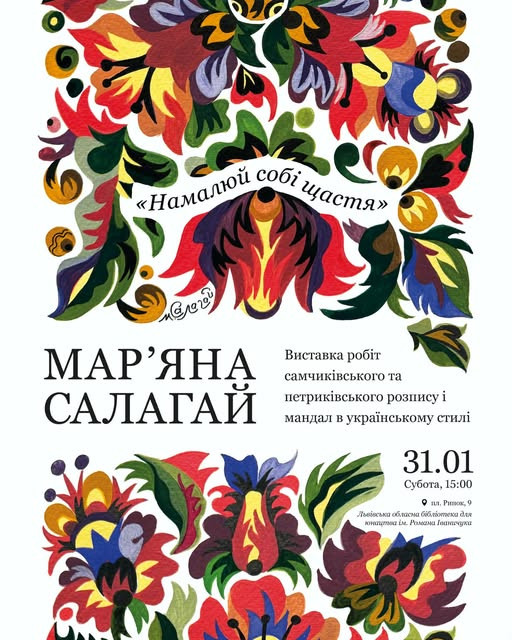 Запрошуємо на відкриття виставки робіт із символічною назвою "Намалюй собі щастя" цікавої, яскравої, самобутньої художниці Мар'яни Салагай.