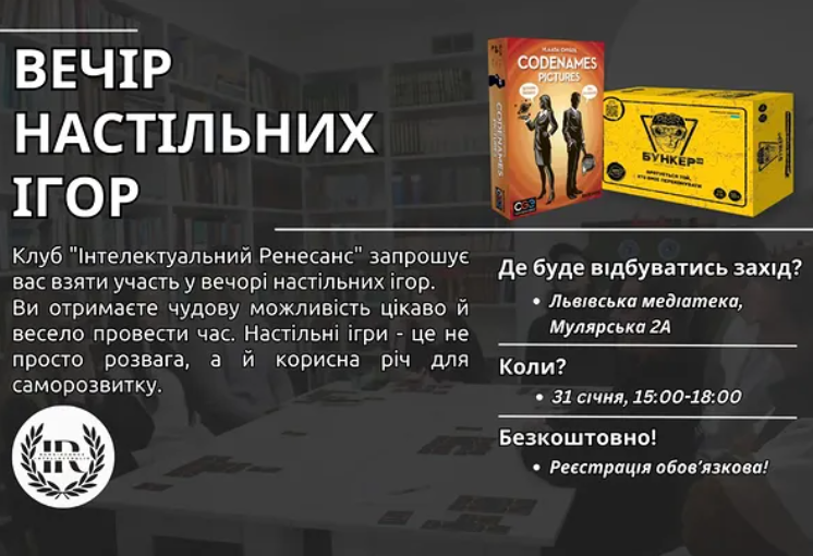 Клуб "Інтелектуальний Ренесанс" запрошує вас взяти участь у вечорі настільних ігор. Ви отримаєте чудову можливість цікаво й весело провести час.