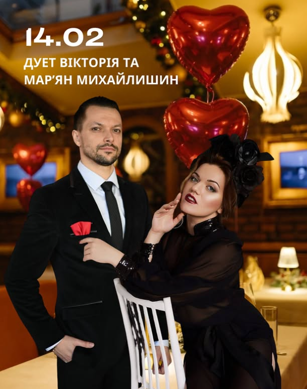 Для вас виступатиме дует Вікторія та Мар'ян Михайлишин — живий вокал, чуттєві композиції та атмосфера, створена для двох.