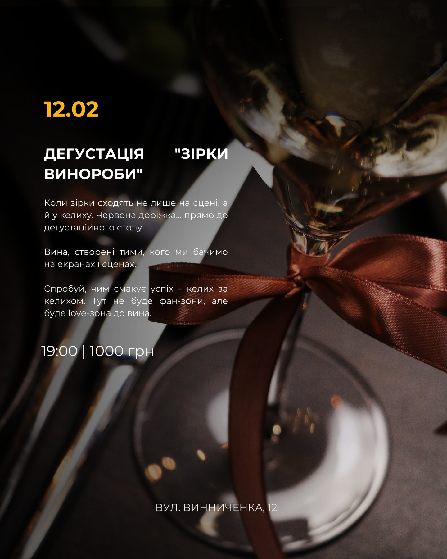 Вина, створені тими, кого ми бачимо на екранах і сценах. Спробуй, чим смакує успіх – келих за келихом. Тут не буде фан-зони, але буде love-зона до вина.