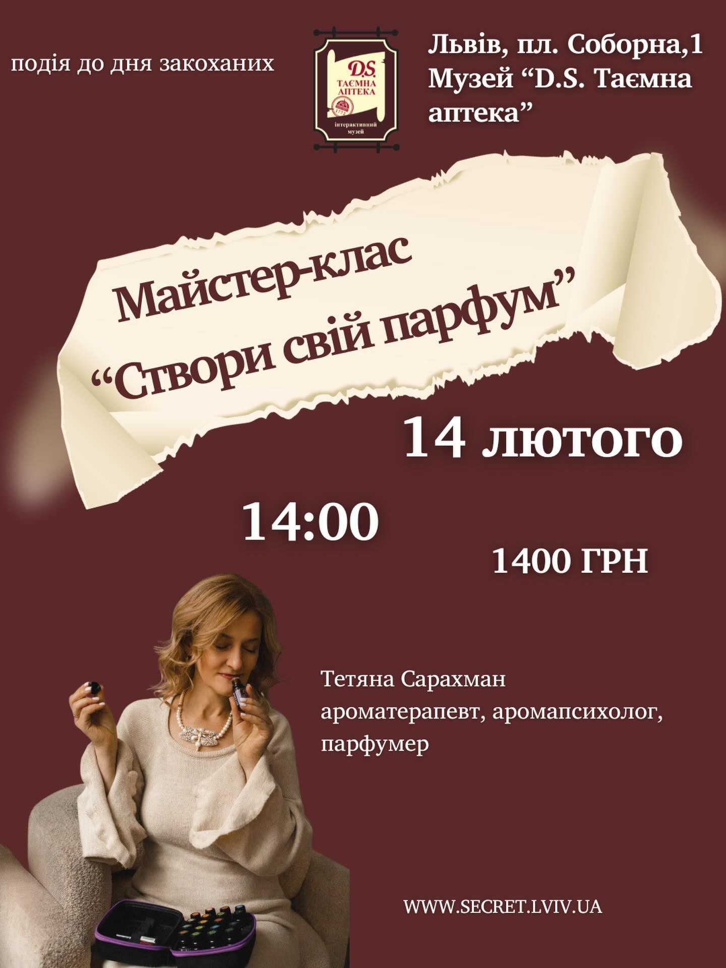 Подію буде вести Тетяна Сарахман — ароматерапевт, аромапсихолог, парфумер.