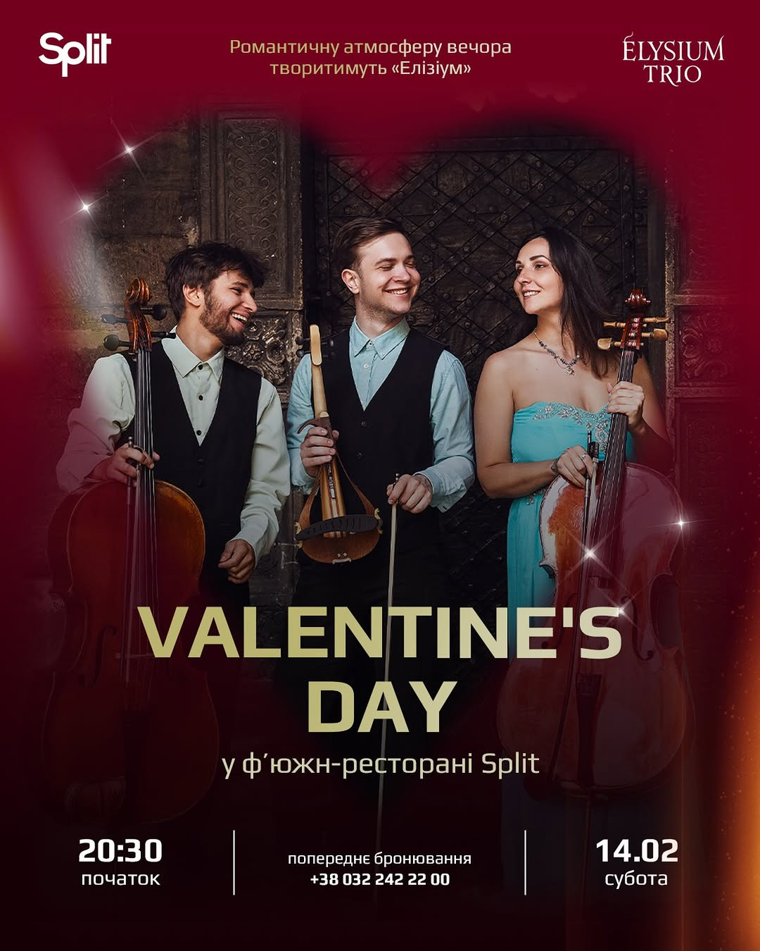 14 лютого вечір у Split звучатиме по-особливому. Романтичну атмосферу створить інструментальне тріо "Елізіум" — скрипка та дві віолончелі, де почуття й емоції народжуються через музику.