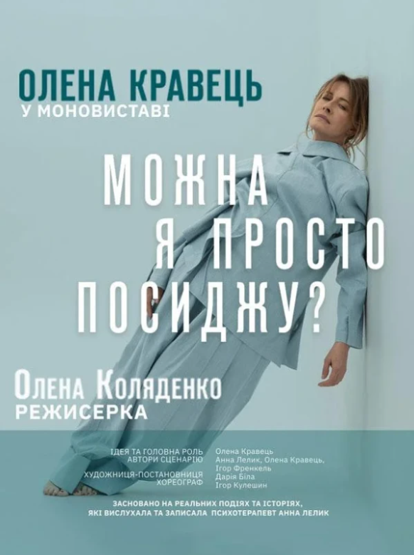 "Можна я просто посиджу?" - моновистава, в якій п'ять різних героїнь проходять шлях переродження. Всі жінки, яких у виставі грає Олена Кравець, приходять до особистих змін не стільки через війну, скільки через усвідомлення цінності життя - його неповторності та унікальності.