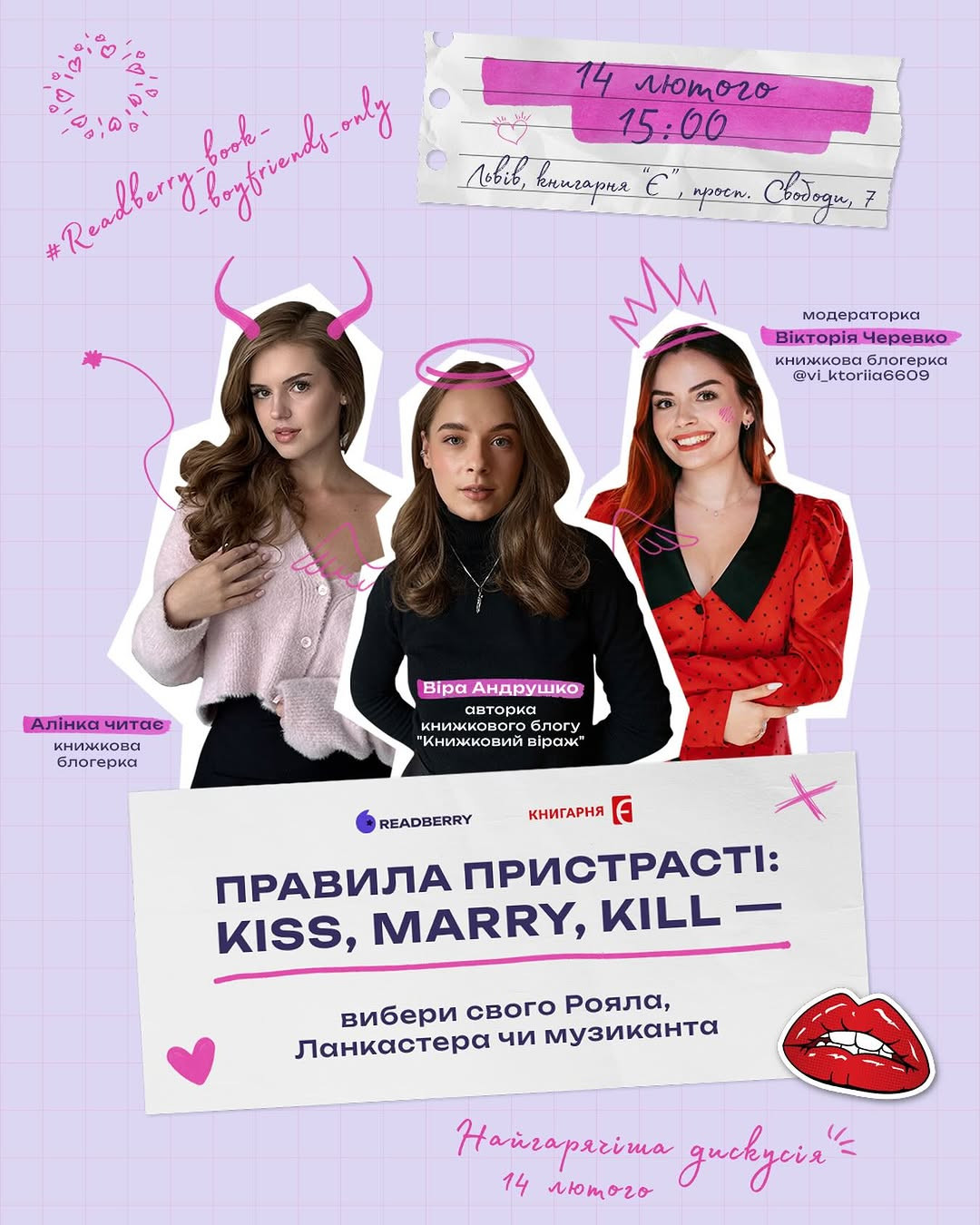 Пропонуємо тобі провести 14 лютого незвичайно й гаряче та завітати на книжкову дискусію у форматі Kiss, Marry, Kill. Обговоримо, хто з книжкових чоловіків заслуговує на поцілунок, з ким хочеться прожити все життя, а кого… краще залишити на сторінках книги.