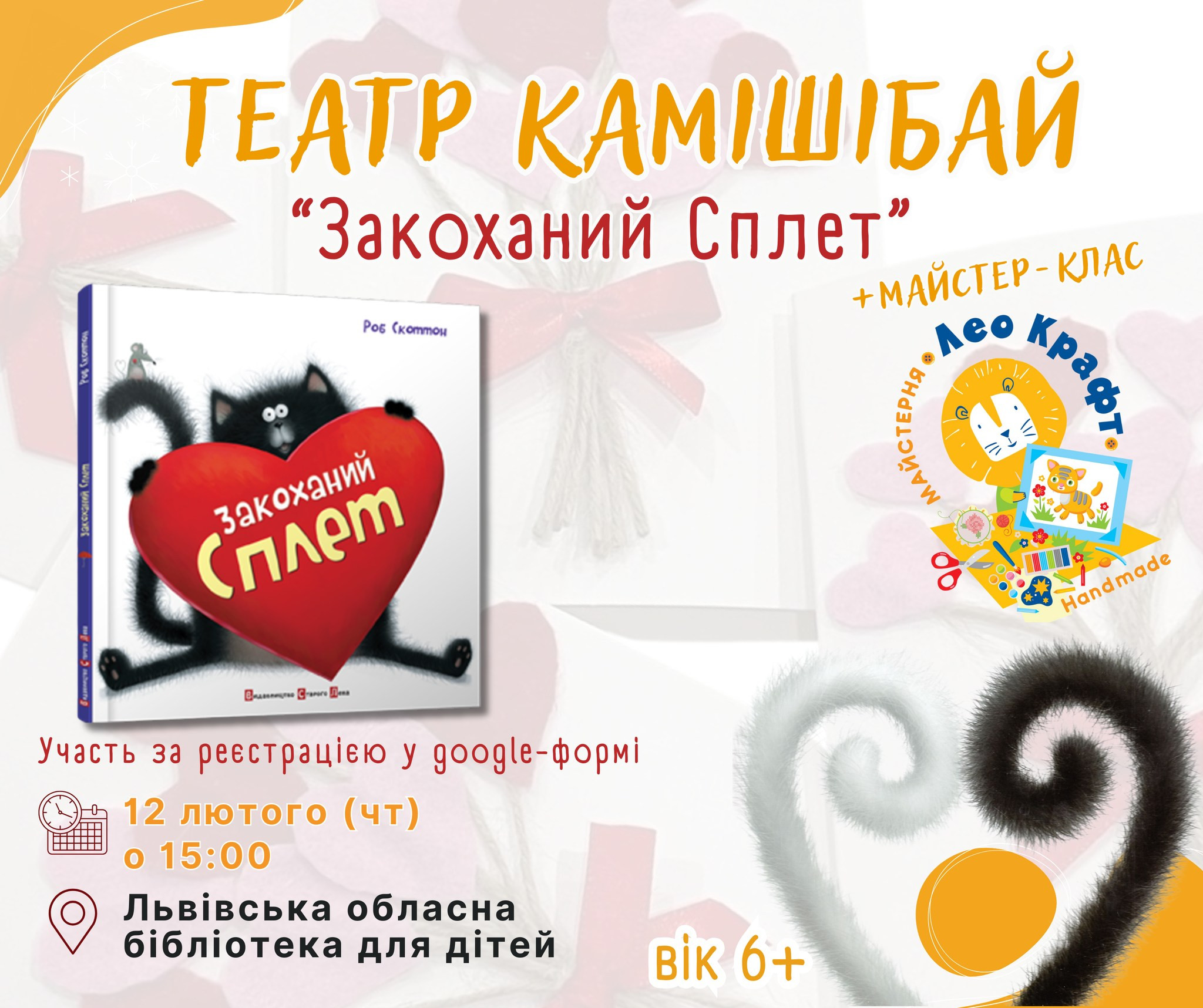 А після вистави — творча майстерка! Разом будемо виготовляти листівку-валентинку власними руками — щоб подарувати її тому, кого любите.