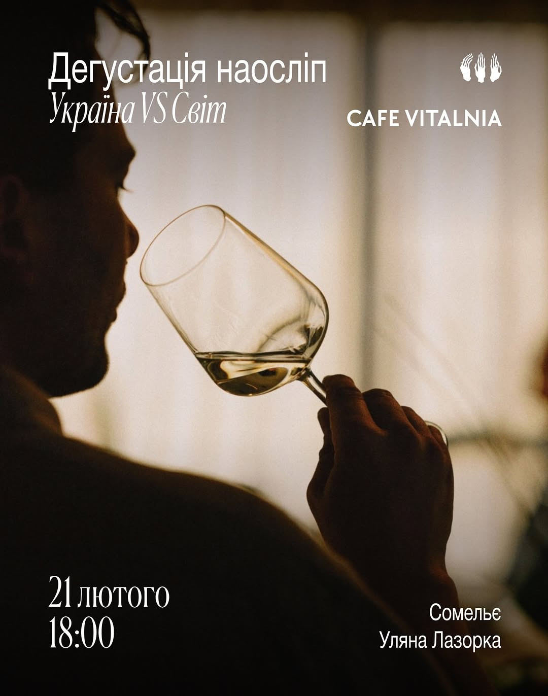 Із супроводом та допомогою Уляни ми смакуватимемо кожне вино наосліп, ділитимемось власним смаковим досвідом і спробуємо вгадати, що саме в нашому келиху — вино, створене українськими виноробами, чи світовий бестселер.