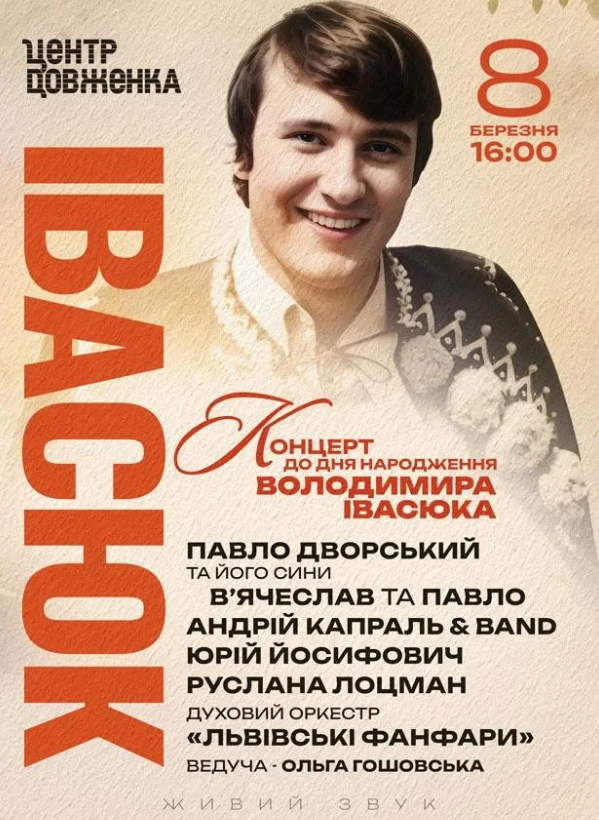 Концерт до дня народження Володимира Івасюка, композитора, чиї пісні стали символом України та голосом кількох поколінь. Цей вечір — не просто ретроспектива легендарних хітів, а жива розмова з музикою Івасюка, яка й сьогодні звучить сучасно, щиро й надзвичайно актуально. Це концерт пам'яті, світла і вдячності людині, що змінила хід української естради.