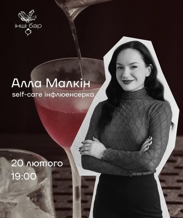 Що ви робите цієї п'ятниці? Точніше не так: нічого не плануйте, бо за барною стійкою — Алла Малкін, self-care інфлюєнсерка.