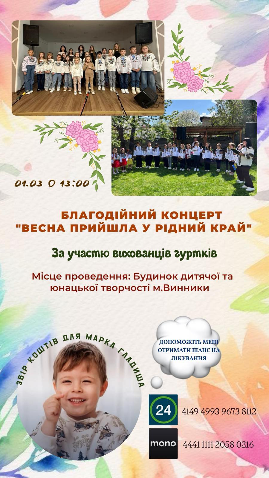 У Будиноку дитячої та юнацької творчості м. Винники відбудеться благодійний концерт на підтримку 3-річного Марка Гладиша.