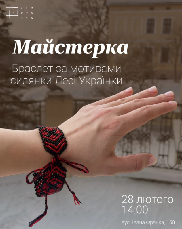 Запрошуємо провести час разом із Музеєм в атмосфері творчості, натхненної українською традицією та постаттю Лесі Українки. Разом із майстринею Ольгою Глібовицькою ви створите прикрасу з унікальною історією та заберете з собою власноруч сплетений браслет на згадку про цей день.