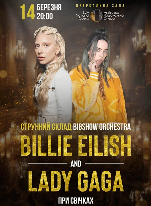 У вишуканій атмосфері Дзеркальної зали прозвучать інструментальні версії найвідоміших композицій двох світових зірок — Біллі Айліш та Леді Гаги — у виконанні струнного складу BIGSHOW ORCHESTRA.
