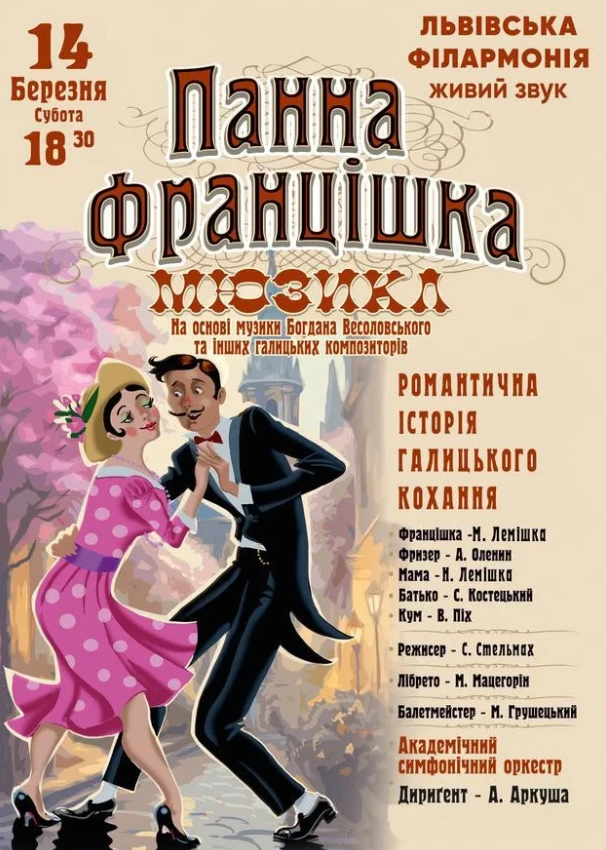 Мюзикл "Панна Францішка" - це романтична та водночас драматична історія галицького кохання, в основу якого лягла музика Богдана Весоловського та інших галицьких композиторів, який отримав спеціальний приз від Європейського фонду культури.