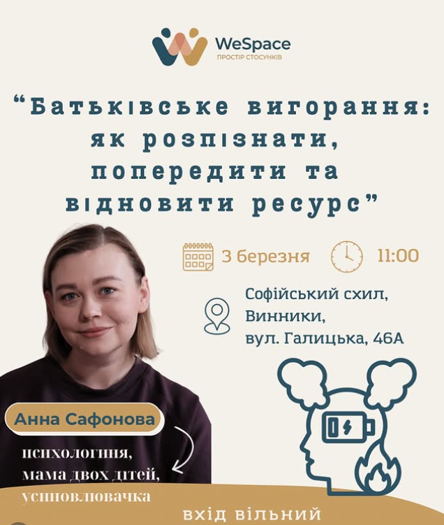 Друзі, з радістю повідомляємо про зустріч, де говоритимемо про батьківське вигорання, як його розпізнати, попередити та відновлювати ресурс.