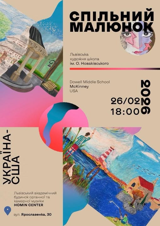 Простір HOMIN center запрошує на відкриття виставки, що презентує результати міжнародного мистецького проєкту співпраці учнів Львівської художньої школи імені Олекси Новаківського та Dowell Middle School (Мак-Кінні, Техас, США).