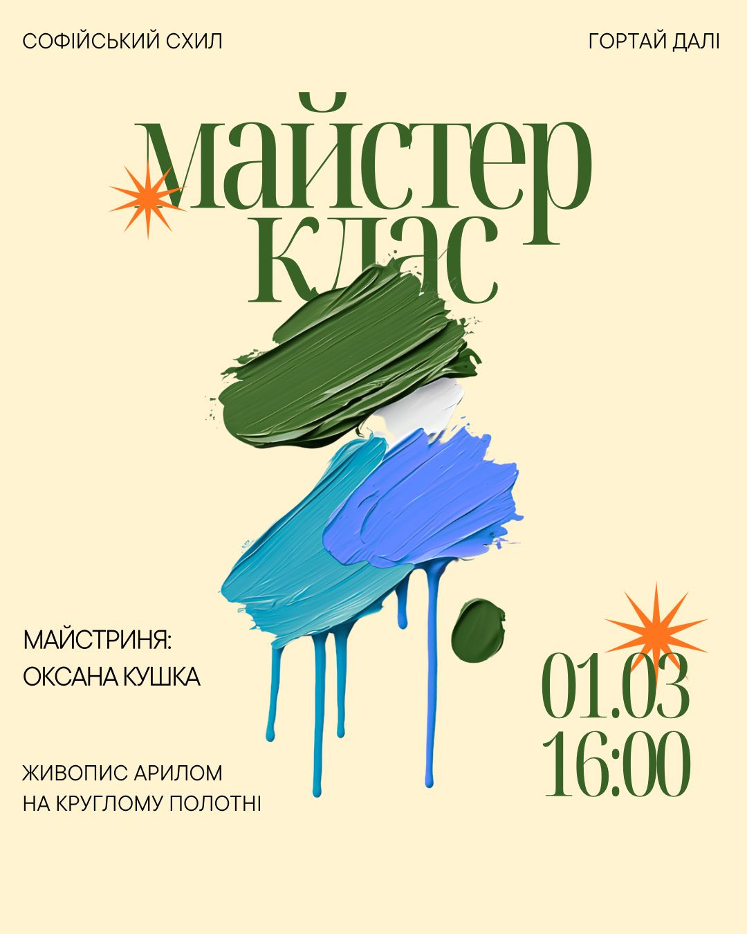 Цієї неділі запрошуємо на атмосферний майстер-клас з живопису з Оксаною Кушкою.